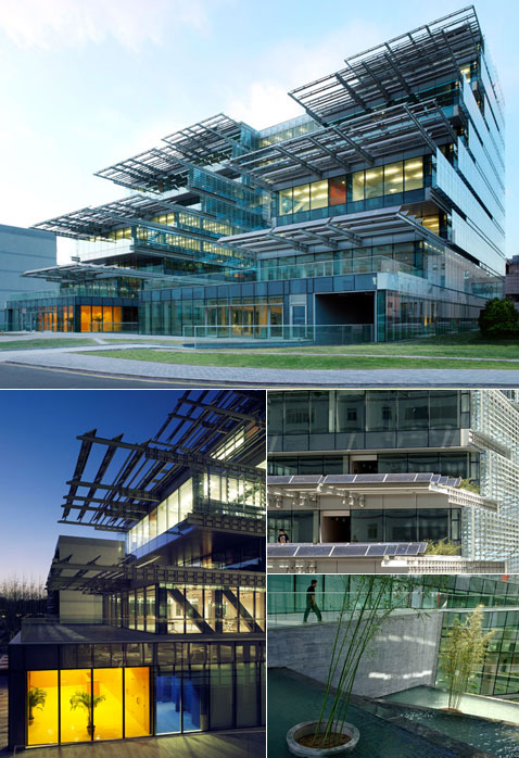 Вложение 184 Можно подумать, что на эту коробочку кто-то случайно наступил. Но нет, эта зелёная "упаковка для студентов" – пример современной, причём именно "зелёной" архитектуры (фото с сайта nottingham.ac.uk). Первое "нулевое" здание в Китае построили итальянцы для британского университета. Такая интернациональность не случайна. Молодые инженеры и архитекторы будут учиться здесь как раз строительству "нулевых" домов, причём не только для Поднебесной, но и для всего мира. Так что авангардное сооружение, появившееся в 200 километрах южнее Шанхая, послужит студентам и учебным корпусом, и живой лабораторией. 20 сентября этого года состоялось торжественное открытие Центра экологически рациональных энергетических технологий (Centre for Sustainable Energy Technologies — CSET). Это научное и учебное учреждение является подразделением университета Ноттингема в Нинбо (University of Nottingham at Ningbo) – то есть китайского кампуса британского вуза. Здание CSET спроектировала итальянская компания Mario Cucinella Architects (MCA), наполнившая его современными решениями, позволяющими максимально полно задействовать природные возможности для терморегуляции и освещения. И, конечно, сооружение это само обеспечивает себя электричеством. Вложение 185 Приличных размеров стеклянная стена обращена на юг. Теплоизоляция на высоте – стена двойная (фотографии Mario Cucinella Architects). Надо отметить, что здания с нулевым балансом энергии (Zero-energy building) постепенно завоёвывают мир. Пока их ещё очень мало, но деваться некуда: не хотите зависеть от надёжности электросетей или скачков цен на нефть – обзаведитесь собственными источниками энергии. Коттеджи, павильоны и даже высотки обзаводятся ветряками и солнечными панелями. Помимо экологии данные (не самые дешёвые) технологии приятны тем, что позволяют заметно экономить на эксплуатации. Наше внимание не раз привлекали дома-электростанции и целые "экогорода": приземлённо-реальные, спорные и совсем уж фантастические. Вложение 186 Как и в случае со свежим проектом подземного стадиона в Дохе, заглубление части рабочих помещений центра служит "климатическим" целям. Да и вообще правильное распределение воздушных и световых потоков в зависимости от высоты положения Солнца над горизонтом обеспечивается всей структурой сооружения (иллюстрации Mario Cucinella Architects). Каждый новый подобный проект оказывается интересным по-своему. Особенно если экологическая чистота и энергетическое самообеспечение новичка сочетается с нетривиальным внешним видом. Где какая стена у CSET? При беглом взгляде и не поймёшь, такое нагромождение ломаных линий. Создавая это причудливое строение, итальянцы черпали вдохновение в китайских фонариках и традиционных деревянных жалюзи и ширмах. Но этот "фонарик" — взгляд в будущее, а не в прошлое. CSET общей площадью 1300 "квадратов" обеспечивается энергией за счёт фотоэлектрических батарей, раскинувшихся рядом, а также – ветряков. Вложение 187 Ветряк и солнечные батареи обеспечивают CSET электричеством, причём здание оборудовано аккумуляторами, способными накапливать энергию, которой хватит на две недели (фото с сайта nottingham.edu.cn). В здании пять надземных и один подземный этаж. Все они соединяются между собой широкой шахтой, выходящей на крышу (но при этом прикрытой от дождя). Этот элемент отвечает сразу за две особенности CSET – он позволяет отражённым лучам солнца про