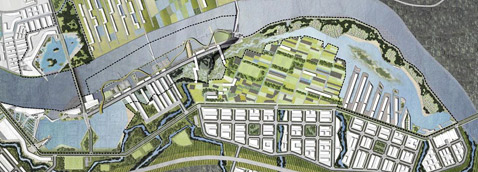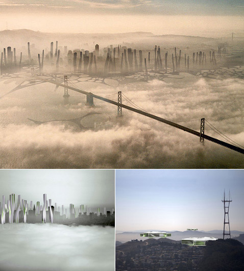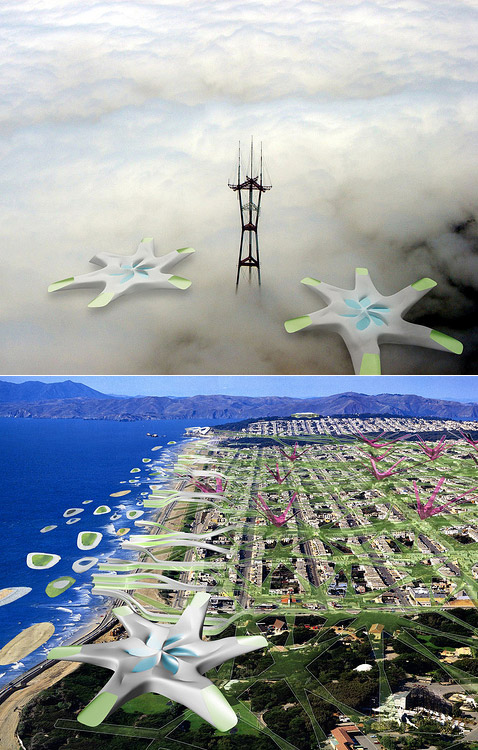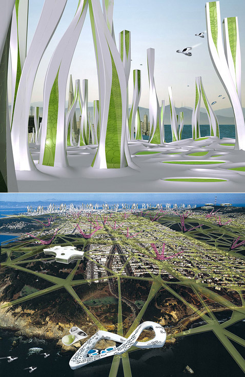 Вид на Сан-Франциско-2108 с холмов Твин Пикс (Twin Peaks). Если вы полагаете, что вдали у берега замысловато изгибаются небоскрёбы, вы ошибаетесь, это вообще не здания. Да и на переднем плане — не коттеджи (иллюстрация IwamotoScott Architecture). Мы много раз видели архитектурные проекты, живописующие дома будущего: экологически "правильные", внешне – необычные и запоминающиеся. Но вот планов целых городов будущего – раз, два и… Это редкость. Тем более, если речь идёт не об абстрактном населённом пункте XXII века, а о переделке существующего мегаполиса. Архитектурная компания IwamotoScott Architecture из Сан-Франциско завоевала $10-тысячный гран-при в конкурсе с говорящим названием City of the Future, проводимом каналом History Channel при спонсорской поддержке компаний Infiniti и IBM. Вообще-то, соревнование это прошло в трёх городах — Вашингтоне, Сан-Франциско и Атланте. В каждом — по 8 команд-претендентов, которые должны были всего за одну неделю придумать, как будет выглядеть их родной город через сто лет, и не только нарисовать картинки, но и продумать многие детали обустройства городов и построить макеты. Вложение 719 Пара видов Сан-Франциско 2108 года смешивает существующие ныне строения с фантастическими объектами (иллюстрации IwamotoScott Architecture). Надо сказать, что в каждом городе одной из команд присуждался гран-при (нас в данном случае заинтересовал экопроект, победивший в Сан-Франциско). Но кроме того, открытое голосование, проводимое сейчас на History Channel, должно определить абсолютного победителя этого состязания, который получит титул National Champion, сдобренный дополнительными $5 тысячами. Это голосование закончится 28 апреля, а победитель будет объявлен 5 мая. Вложение 720 Туман в Сан-Франциско — дело обычное. Авторы проекта учли это и "применили" в нём "каприз" местной погоды на пользу городу (иллюстрации IwamotoScott Architecture). IwamotoScott полагает, что Сан-Франциско — один из самых зелёных городов в США – может стать ещё зеленее, а помочь ему в этом должна фантастическая система под названием Hydro-Net. В ней самые передовые "зелёные" технологии соединяются с реально существующими климатическими и геологическими условиями этого мегаполиса, достигая потрясающего эффекта. Вложение 721 Hydro-Net на плане города. Внизу: а так выглядела бы эта сеть при взгляде из глубины земли, если бы грунт был прозрачный (иллюстрации IwamotoScott Architecture). "Число городских жителей в будущем резко увеличится. С учётом этого факта данное видение будущего Сан-Франциско предлагает новую инфраструктуру, лежащую ниже поверхности города, которая поможет максимизировать и рационально распределять ресурсы", — говорит эксперт History Channel архитектор Ричард Мейер (Richard Meier), комментируя заявку IwamotoScott. Итак, Hydro-Net – это большой набор техники, призванной производить экологически чистую энергию и питьевую воду, а также – это сеть для распределения и того, и другого, а заодно и транспортная система. Вложение 722 Макет фрагмента Hydro-Net и вид изнутри этой многофункциональной системы (иллюстрации IwamotoScott Architecture). В основе Hydro-Net лежит сеть из огромных глубинных туннелей и узлов, скрытых под городом (вырыть их должны, понятно, роботы). Здесь находятся резервуары для накопления воды и водорода, здесь пролегают трубы из сверхпрочных материалов (на основе углеродных нанотрубок), распределяющие воду и топливо поперёк всего мегаполиса, здесь проложены кабели энерг
