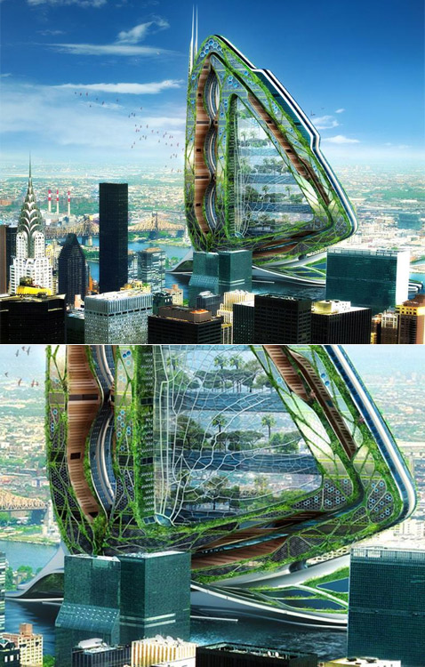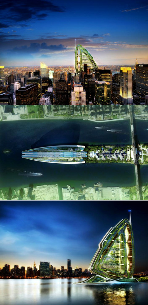Выдержит ли такая махина испытание океаном… и временем? (иллюстрация Vincent Callebaut). Сегодня мир волнуют три основные проблемы: глобальное потепление, цена на нефть и продовольственный кризис. Мы не смогли устоять и не поговорить о первом пункте. Тем более что нам в руки попалось столь элегантное, если не сказать гламурное, решение проблемы затопления приличной части суши. В двадцатом веке общий подъём уровня мирового океана составил всего лишь десять сантиметров, нынешнему же веку прогнозируют все пятьдесят! (А ведь для этого достаточно, чтобы растаял всего лишь 1% антарктического льда.) Французский архитектор бельгийского происхождения Венсан Каллебо (Vincent Callebaut), уже известный нашим читателям, проникся причитаниями экологов и решил создать Lilypad. Своё детище он описывает незамысловато: "плавучий экополис для климатических беженцев". Вложение 739 "Биотехнологический" Lilypad будет путешествовать от экватора к полюсам, следуя за морскими течениями. О том, сможет ли город-амфибия "стоять" на одном месте или выбирать направление своего движения, Венсан ничего не говорит (иллюстрация Vincent Callebaut). Гигантский город-лилия рассчитан на 50 тысяч жителей, тех самых "эмигрантов", что будут сбегать от последствий глобального потепления с Большой земли. Правда, по прогнозам Межправительственной группы эволюции климата (Intergovernmental Panel on Climate Change — IPCC), организации созданной при ООН в 1988 году, в зоне бедствия могут оказаться до 25 миллионов жителей нашей планеты. Поэтому Каллебо постарался на славу, планируя возможное будущее значительной части населения Земли. Внешне Lilypad очень похож на плавающий лист водяной лилии (а именно самой большой из них — амазонской). Отсюда и название всего проекта, и даже в какой-то мере его внутреннее строение. Вложение 740 Во всей красе и в соответствии со всеми стандартами. Кстати, если присмотреться, то под первым ярусом можно разглядеть три пристани для яхт (иллюстрации Philippe Steels/pixelab). Что же представляет собой столь масштабный "корабль"? Ясное дело, гору электроники и сплошь "зелёные" решения. Так, "двойная кожа" строения сделана из высокопрочного полиэфирного волокна, покрытого слоем диоксида титана. Последний под воздействием ультрафиолета разлагает загрязняющие атмосферу вещества посредством фотокаталитической реакции. К этому добавляем солнечные батареи, энергию ветра и приливов, энергию биомассы Земли, очистку воды с помощью явления обратного осмоса и фитоочищение, и так далее, и тому подобное. В общем, полный список. Вряд ли Венсан продумал всё до мелочей. Но площади (порядка 500 тысяч квадратных метров), несомненно, позволят воткнуть на Lilypad любые установки, которые принесут хоть сколько-нибудь пользы жителям "экополиса". Вложение 741 "Всё брал у природы", — не стесняясь, признаётся в плагиате Венсан Каллебо. Ну и пусть! Гигантский "потомок" лилии спасёт жителей Нью-Йорка, Бомбея, Калькутты, Хошимина, Шанхая, Майами, Лагоса и Абиджана, Джакарты и египетской Александрии (фото с сайта vincent.callebaut.org). На плаву трёхгорбая махина будет стабилизироваться за счёт балласта, которым фактически является лагуна, расположенная в центре Lilypad и наполненная пресной водой. Она полностью погружена в океан, в ней будет собираться и перерабатываться дождевая вода. Что ж, поверим автору на слово. Остаётся надеяться, что дожди можно будет "найти"